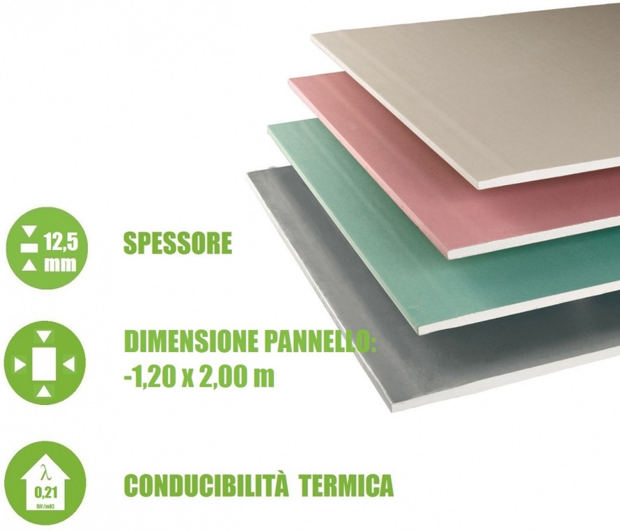 Pannello composto da uno strato di gesso ( Solfato di Calcio bi-idrato ) con addittivi specifici, incorporato fra due fogli di cartone speciale ad alta resistenza.