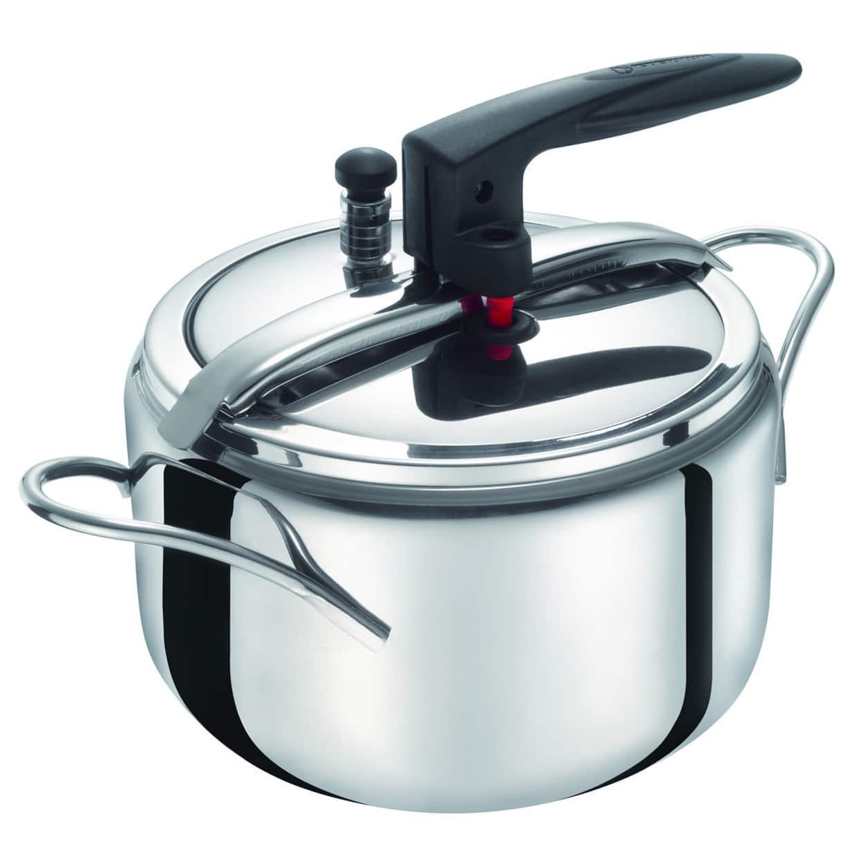 Corpo in acciaio inox 18/10 ad elevato spessore, fondo thermo radiant in triplo con alluminio, adatto per utilizzo su piani ad induzione, triplo sistema di controllo pressione, sistema di sicurezza “SystemBlock”.
