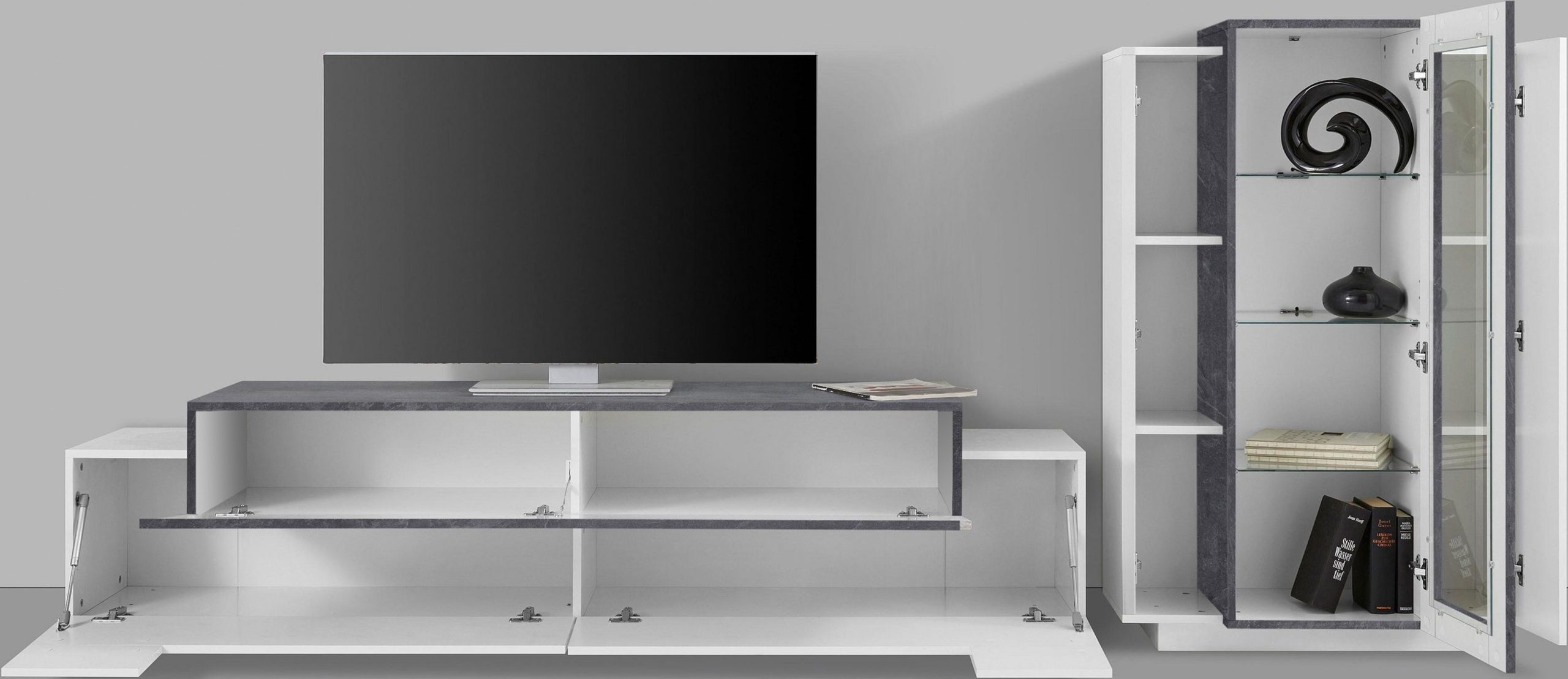 Il soggiorno CORO con porta TV + vetrina è largo 200 cm è la soluzione perfetta per rendere il soggiorno sempre più ordinato e moderno. Il design, realizzato con materiali di qualità 100% italiani, risulta robusto e versatile, riuscendo ad adattarsi a qualsiasi tipo di stile vogliate inserirlo.