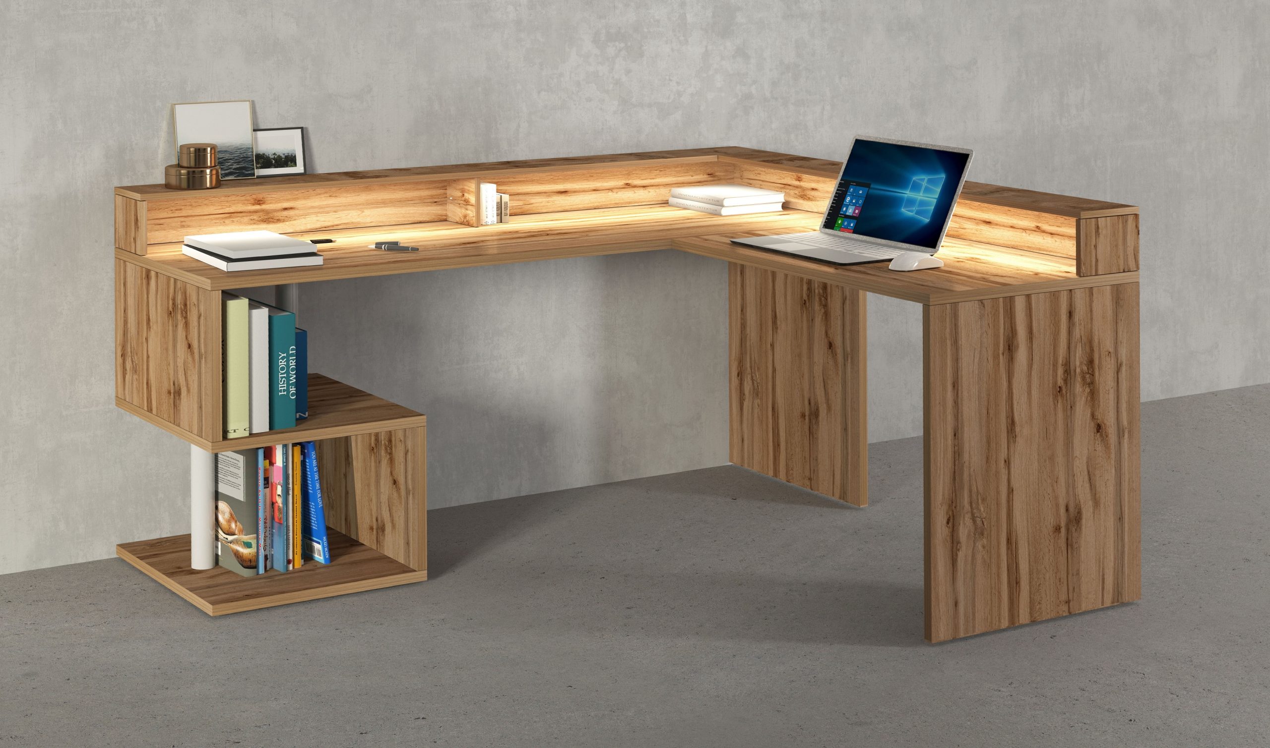 Disponibile nei colori bianco laccato, report e rovere, la scrivania ESSE angolare con sopralzo si adatta perfettamente a diversi ambienti e gusti. Con questo complemento d’arredo, puoi creare un’area di lavoro o studio funzionale e adatta a lavorare in maniera confortevole.