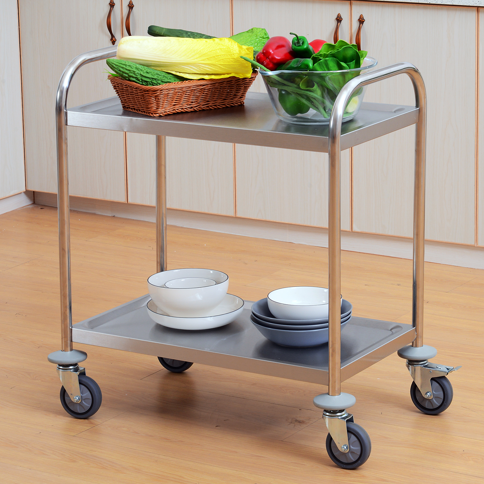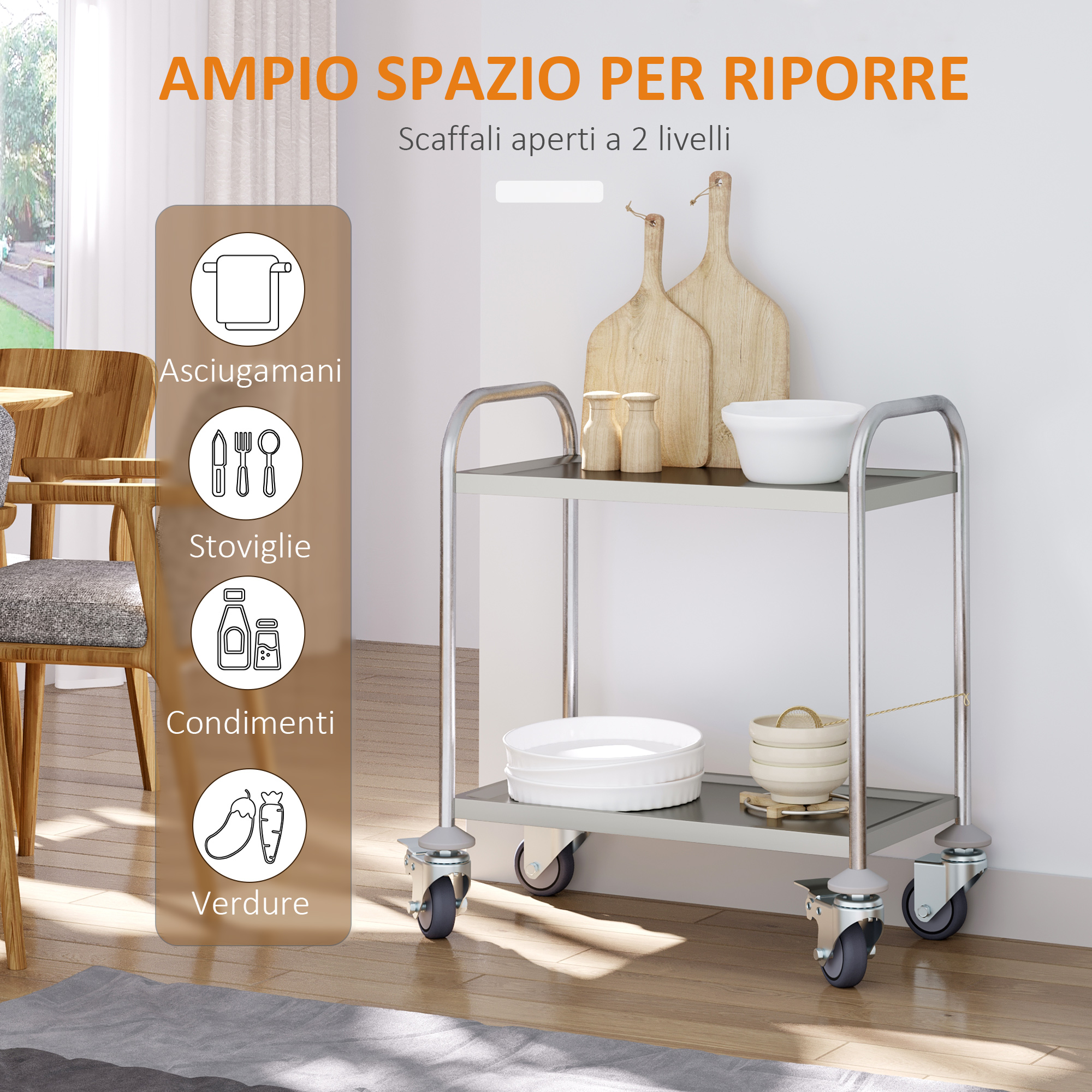 Organizzate la vostra cucina con questo carrello da cucina elegante e versatile di [ITALFROM HOME DESIGN], Realizzato in acciaio inossidabile di alta qualità, i 2 ripiani offrono ampio spazio per una varietà di articoli e utensili, Le 4 rotelle con 2 freni di bloccaggio lo rendono semplice da spostare e riposizionare, Offre ampio spazio per una varietà di articoli e utensili, Ideale anche per uso in hotel, ristoranti, catering e altro ancora,