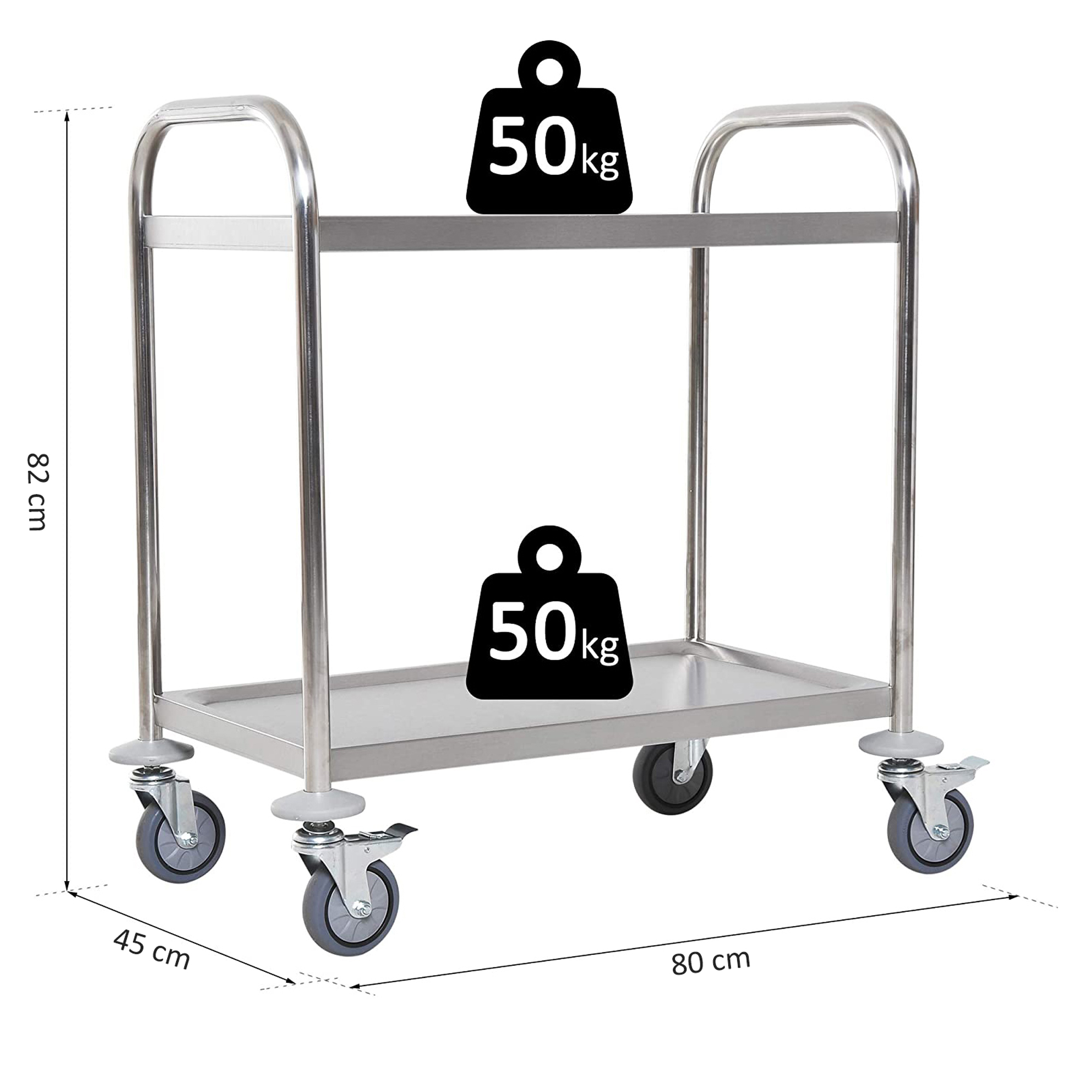 Carrello Cucina 2 Ripiani, Carrello con Ruote Portatutto, Carrello Portavivande in Acciaio Inox, 80x45x82cm, Argento