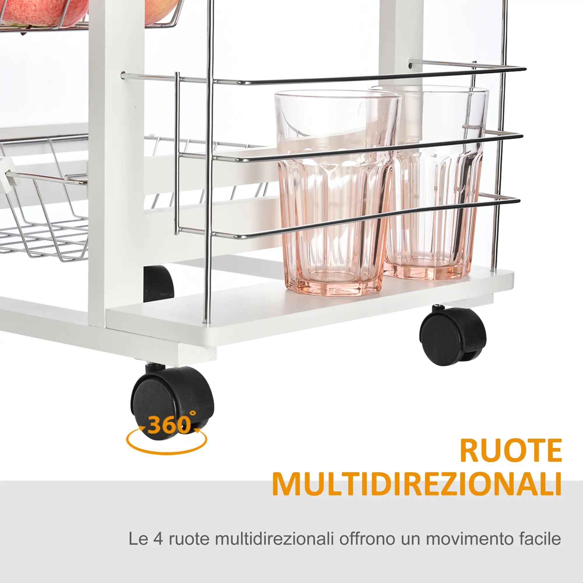 Affetta la cipolla sul piano d’appoggio, scegli i pomodori più maturi dai cestelli estraibili, prendi il basilico dal portaspezie et voilà, Hai tutto quel che ti serve per preparare il tuo sugo migliore, proprio a portata di mano! Questo carrello da cucina [ITALFROM HOME DESIGN], infatti, diventerà il tuo (indispensabile) assistente: ti offre tanto spazio extra per cucinare o per organizzare cibi e utensili, In più, grazie alle 4 ruote, puoi spostarlo comodamente da una stanza all’altra,