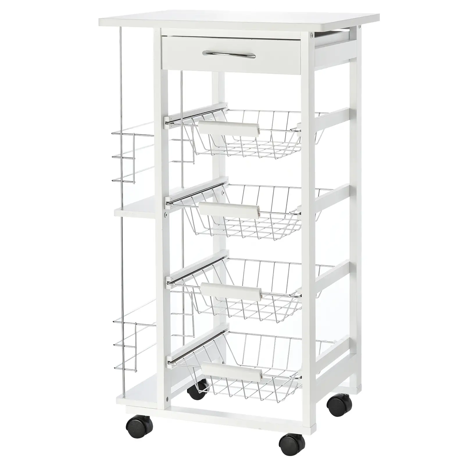 Carrello da Cucina Salvaspazio in Legno Bianco, Portavivande con 1 Piano di Lavoro 1 Cassetto e 4 Cestelli Metallici, 47x37x83cm