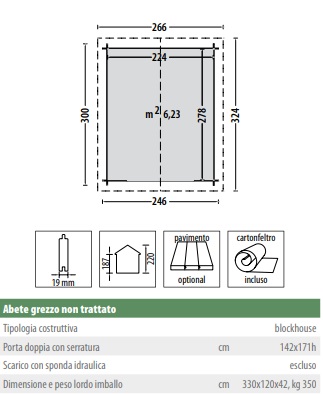 Descrizione La pensilina Dinan Flat Roof Douglas è un prodotto di qualità superiore progettato per essere installato su una soletta in cemento. È ideale per l’uso domestico e per lo stoccaggio di prodotti non pericolosi. Il legno utilizzato per l’edilizia è naturalmente durevole e resistente, non necessita di trattamenti chimici ed è poco suscettibile all’attacco degli insetti. La finitura della pensilina è curata, con un aspetto bruno-rosato che le conferisce un aspetto elegante. Il tetto piano e il montaggio con collegamento angolare gli conferiscono uno stile molto moderno. Il prodotto viene fornito di serie con kit base per l’ancoraggio al suolo, e la copertura è realizzata in vaschetta di acciaio ultra resistente per garantire una lunga durata. Si consiglia di applicare un saturatore per preservare il legno (interno ed esterno). Questo prodotto è fabbricato in Europa ed è certificato PEFC. Caratteristiche Complessivamente 3,39 x 3,39 mt Terra 3,00×3,00 mt Altezza della cresta 2.342 m Superficie utile 8,47 mq Interno 2,91 x 2,91 mt Questione Abete Douglas massiccio non trattato Superficie esterna 11,49 m² Colore Legno naturale Muri Doghe maschio-femmina spesse 28 mm da fissare ai pali Garanzia Legno 5 anni contro attacchi di insetti e marciume/copertura 10 anni Trattato Senza Proiezione del tetto Anteriore 145 mm / Posteriore 145 mm Coperta Vassoio in acciaio garantito 10 anni Porta 2 bocchette con vetrata in PVC dimensioni 1,60 x 1,86 m Pendenza del tetto 2 Fornitore FORESTA Codice EAN 3760161070935