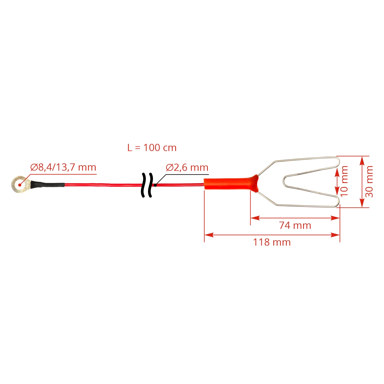 Il collegamento al dispositivo avviene tramite l’occhiello, il collegamento al recinto elettrico tramite l’altra estremità del filo. Il collegamento sicuro al recinto può essere effettuato sia per recinti in filo metallico che in nastro.