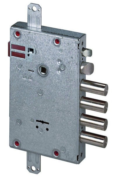 Elettroserratura da applicare a doppia mappa. 4 mandate e scrocco autobloccante richiamabile elettronicamente, predisposizione per chiusure supplementari, 3 chiavi lunghe, tensione 12 V ca.
