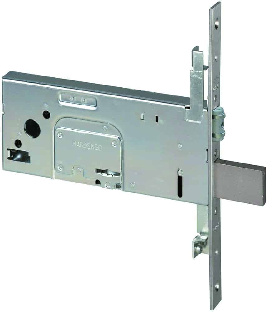 Serratura doppia mappa ambidestra da infilare per fasce. 4 mandate, chiusura triplice, catenaccio e rullo regolabile, frontale in acciaio inox, scatole mm. 185/195×78.