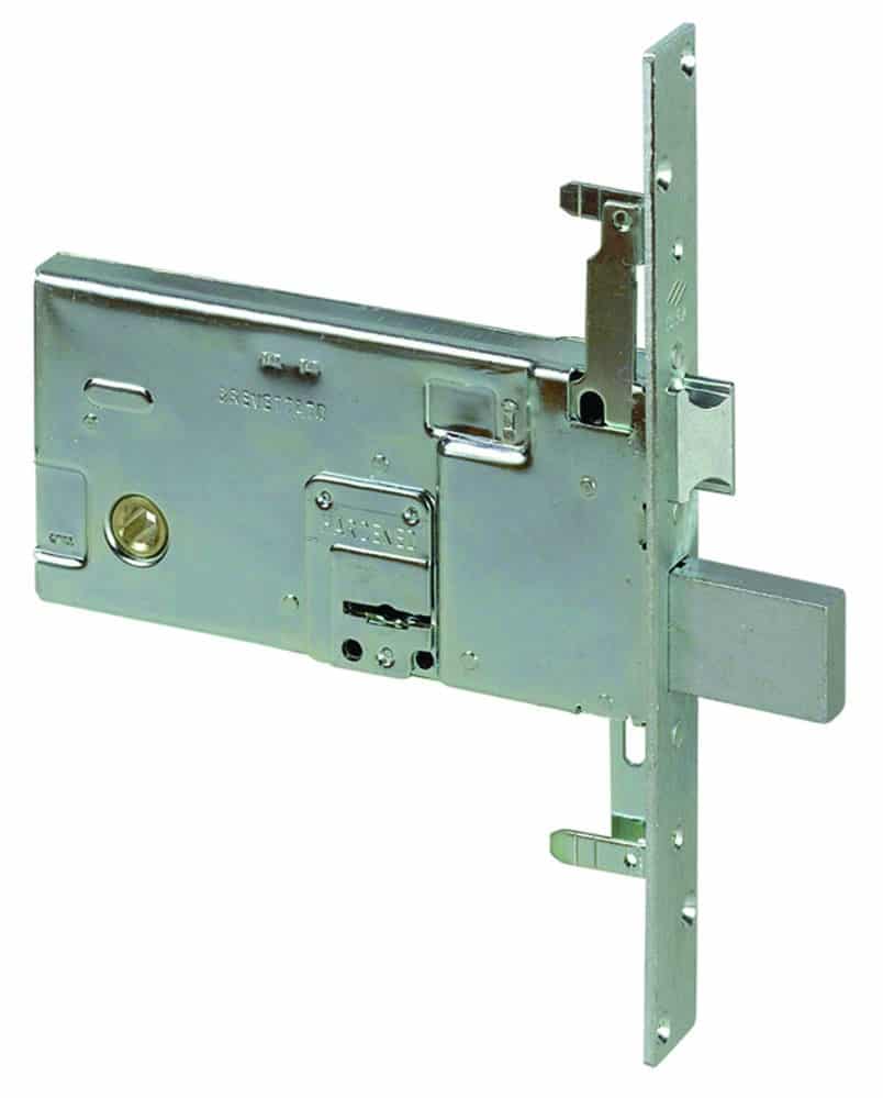 Serratura a doppia mappa da infilare per fasce. 4 mandate e scrocco, 3 punti di chiusura, protezione antitrapano, senza aste, 2 chiavi, zincata, scatola mm. 166×82.