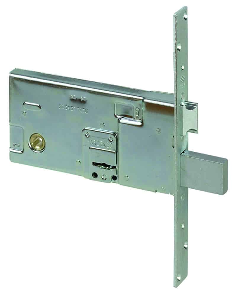 Serratura a doppia mappa da infilare per fasce. 4 mandate e scrocco, copritoppa da saldare, protezione antitrapano, 2 chiavi, zincata, scatola mm. 166×82.
