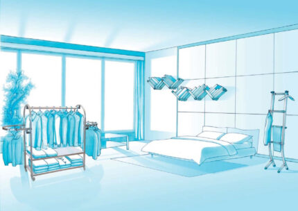 Capiente ed agevole struttura guardaroba su ruote con barre laterali reclinabili e due piani d’appoggio modulari,realizzati con pianetti forati in polipropilene