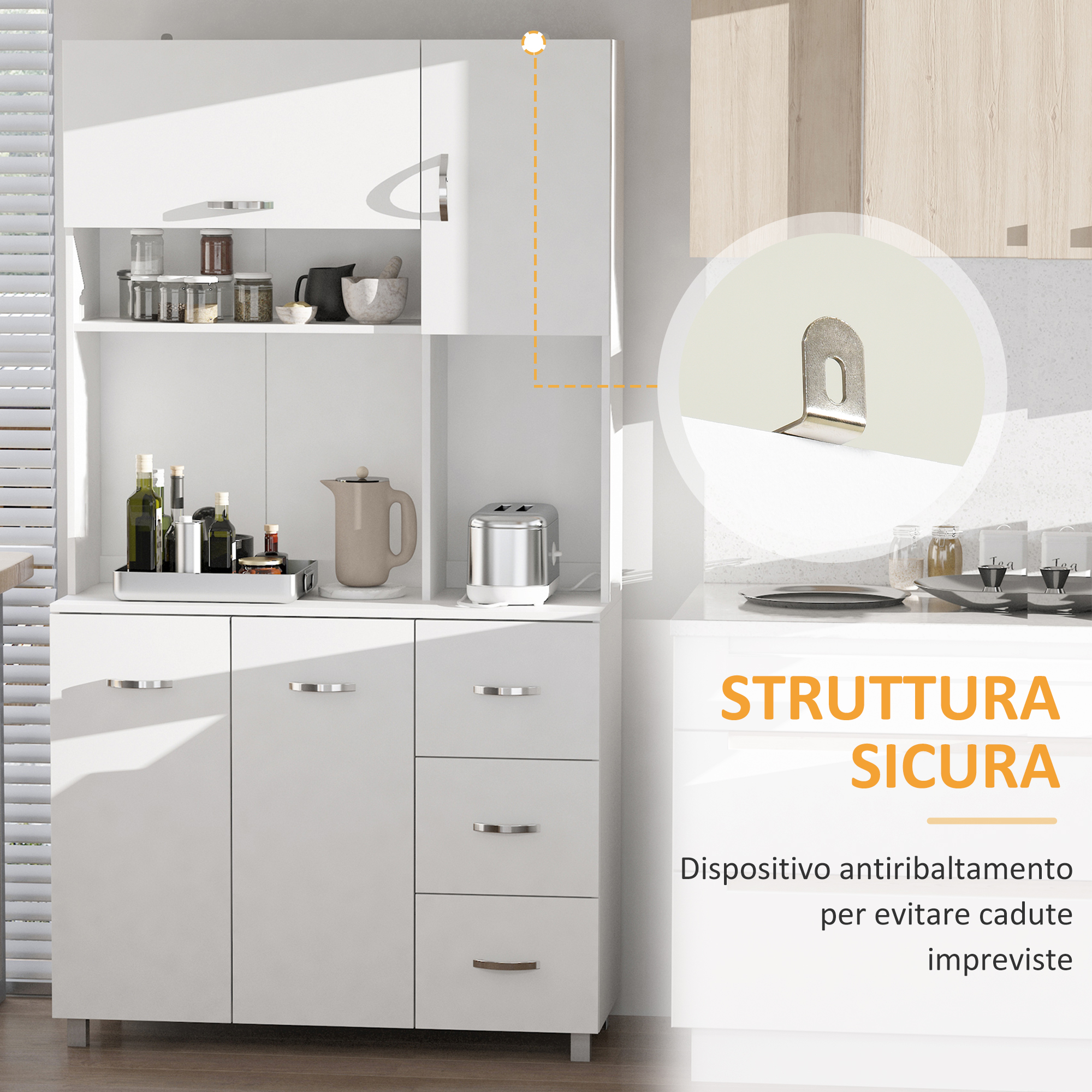 Organizza al meglio gli spazi di casa con la nostra credenza alta [ITALFROM HOME DESIGN], Con una solida struttura in legno truciolare, il mobile dispensa ha 3 scomparti aperti, 3 cassetti e 2 armadietti, che ti consentono di trovare posto a tutto in modo ordinato, Il design minimalista e la finitura bianca ti consentono di utilizzare il mobile cucina dove preferisci e abbinarlo all’arredo già presente nella tua casa,