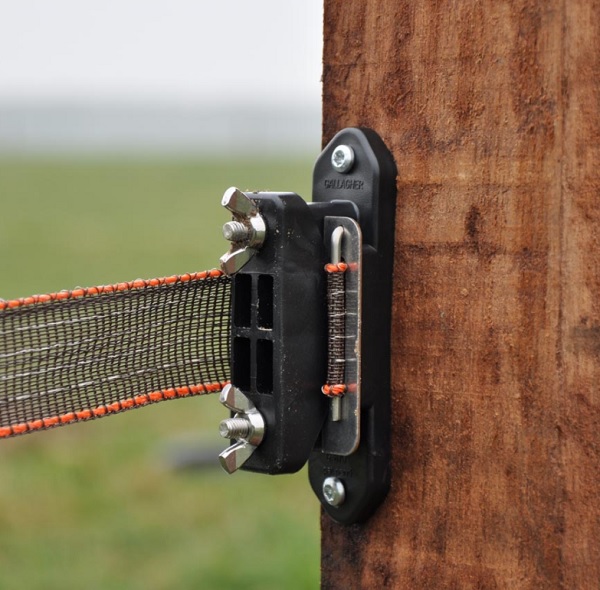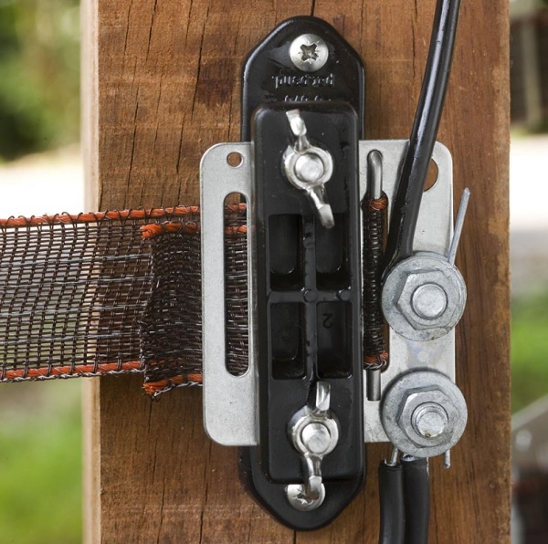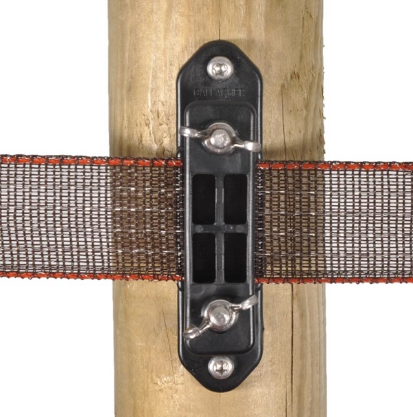 Isolatore d’ angolo, in plastica d’alta qualità, appositamente studiato per fissare il nastro tra due inserti in gomma (sistema brevettato), assicurandone una lunga durata. Utilizzare la piastra di collegamento in acciaio inossidabile per i pali di testa (cancello) in modo da garantire ottimi collegamenti elettrici.