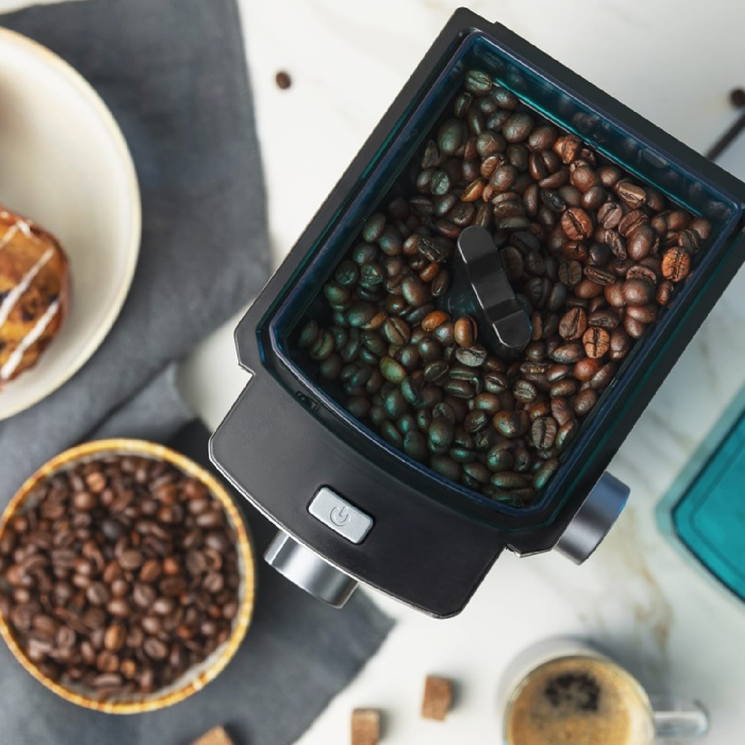 Macina caffè in acciaio inossidabile da 150 W, 17 livelli di macinatura e capacità fino a 12 tazze.