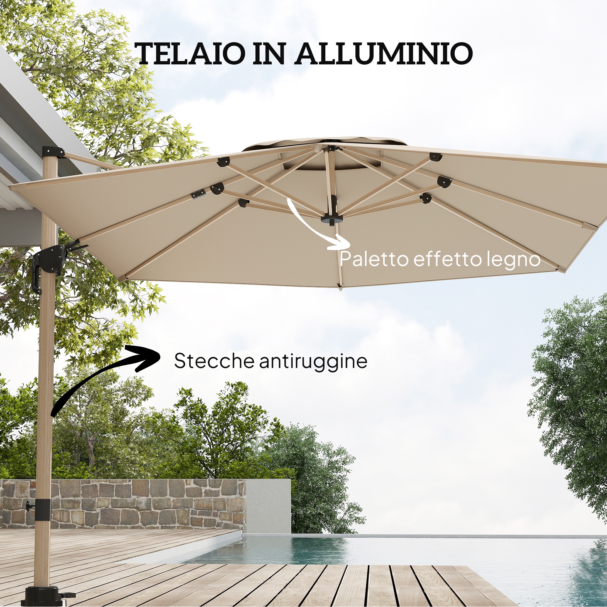 Ombrellone a Sbalzo Inclinabile con Manovella e Base, in Alluminio, Metallo e Poliestere, 4,1×2,9×2,7A m, Kaki