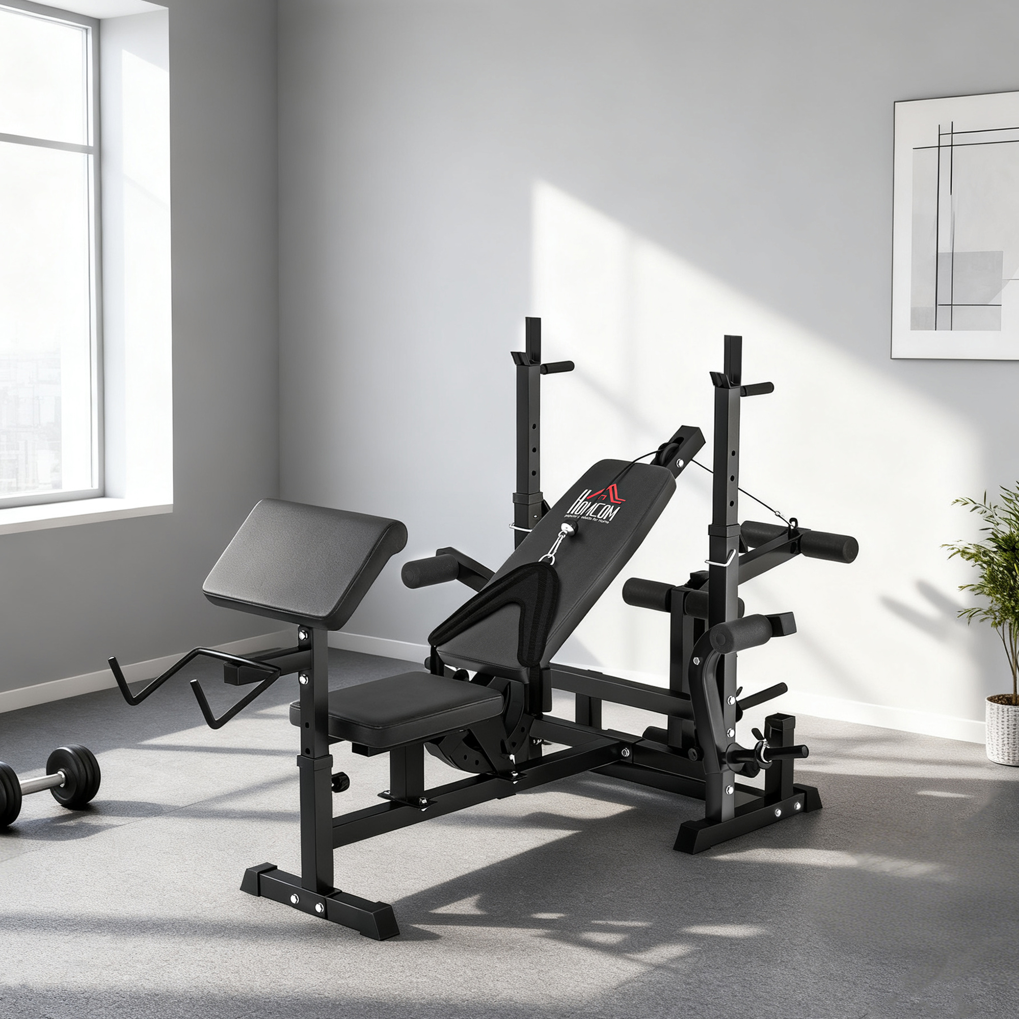 Questa panca da palestra [ITALFROM HOME DESIGN] è il supporto perfetto per chi desidera sviluppare e tonificare il proprio fisico, La struttura è dotata di un appoggio per preacher curl, curl per le gambe, panca piana e fasce di resistenza per allenare diverse parti del corpo, Realizzata in acciaio per solidità, la panca ha una base estesa per assicurare la stabilità, Inoltre, presenta un supporto per bilancieri regolabile e dei cuscini imbottiti e rivestiti in PU liscio e facile da pulire,