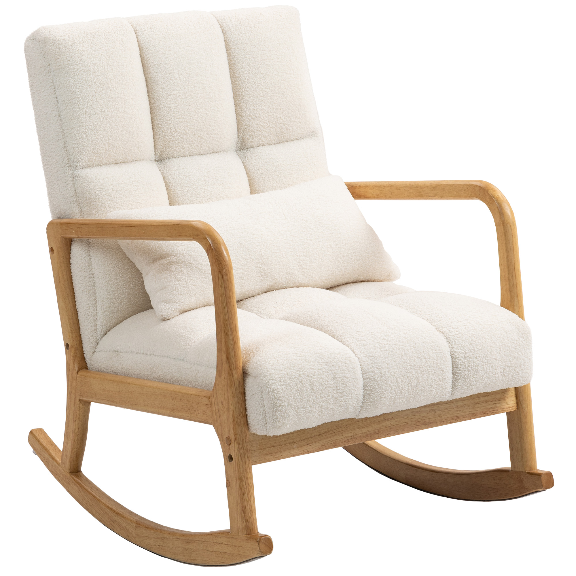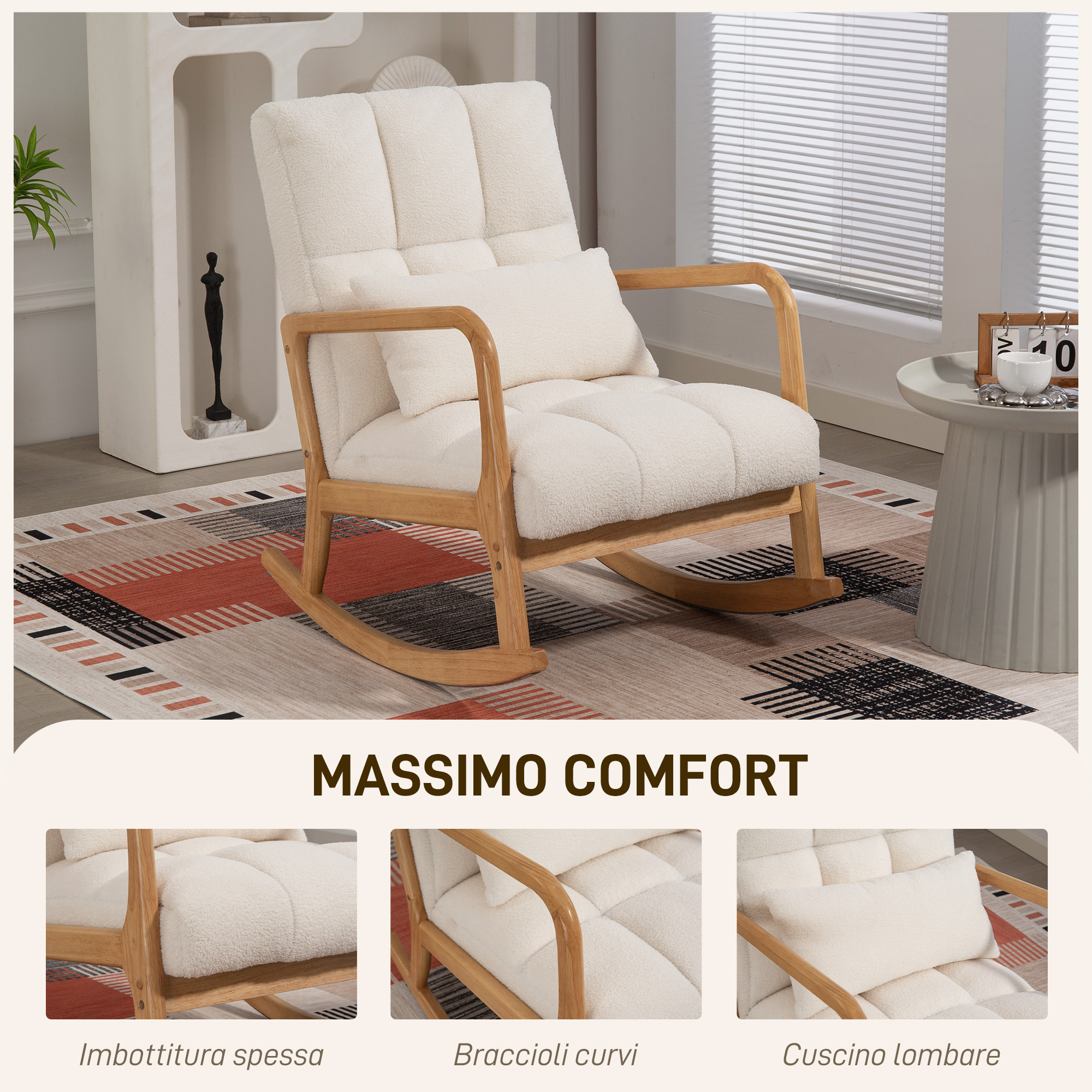 Poltrona a Dondolo 90°-130° con Cuscino Lombare rivestita in Tessuto Sherpa, 64,5x82x89 cm, Bianco e color Legno