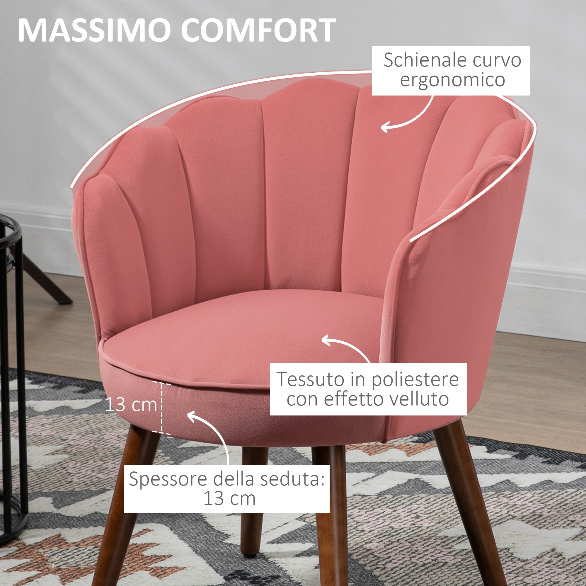 Poltrona Imbottita con Schienale a Conchiglia e Gambe in Legno, Poltrona in Velluto per Salotto e Camera, 66x66x78,5cm, Rosa