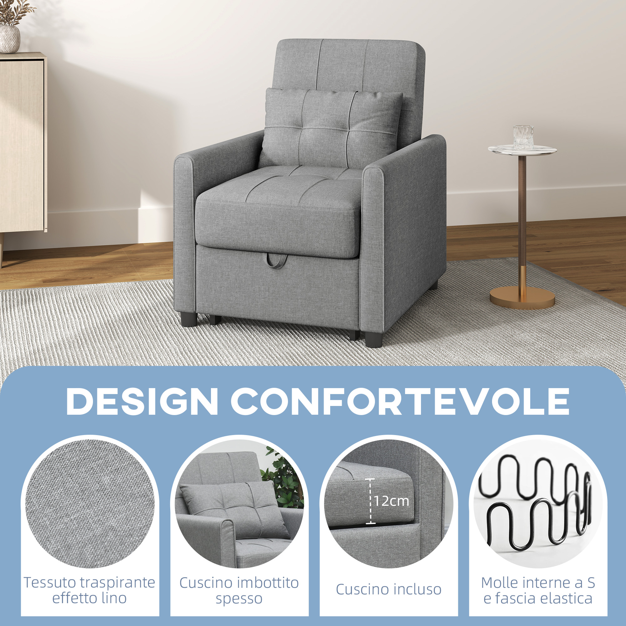 Poltrona Letto Singola Reclinabile su 3 Livelli con Cuscino Extra e 2 Tasche Laterali, 69x82x85cm, Grigio Chiaro | Aosom Italy