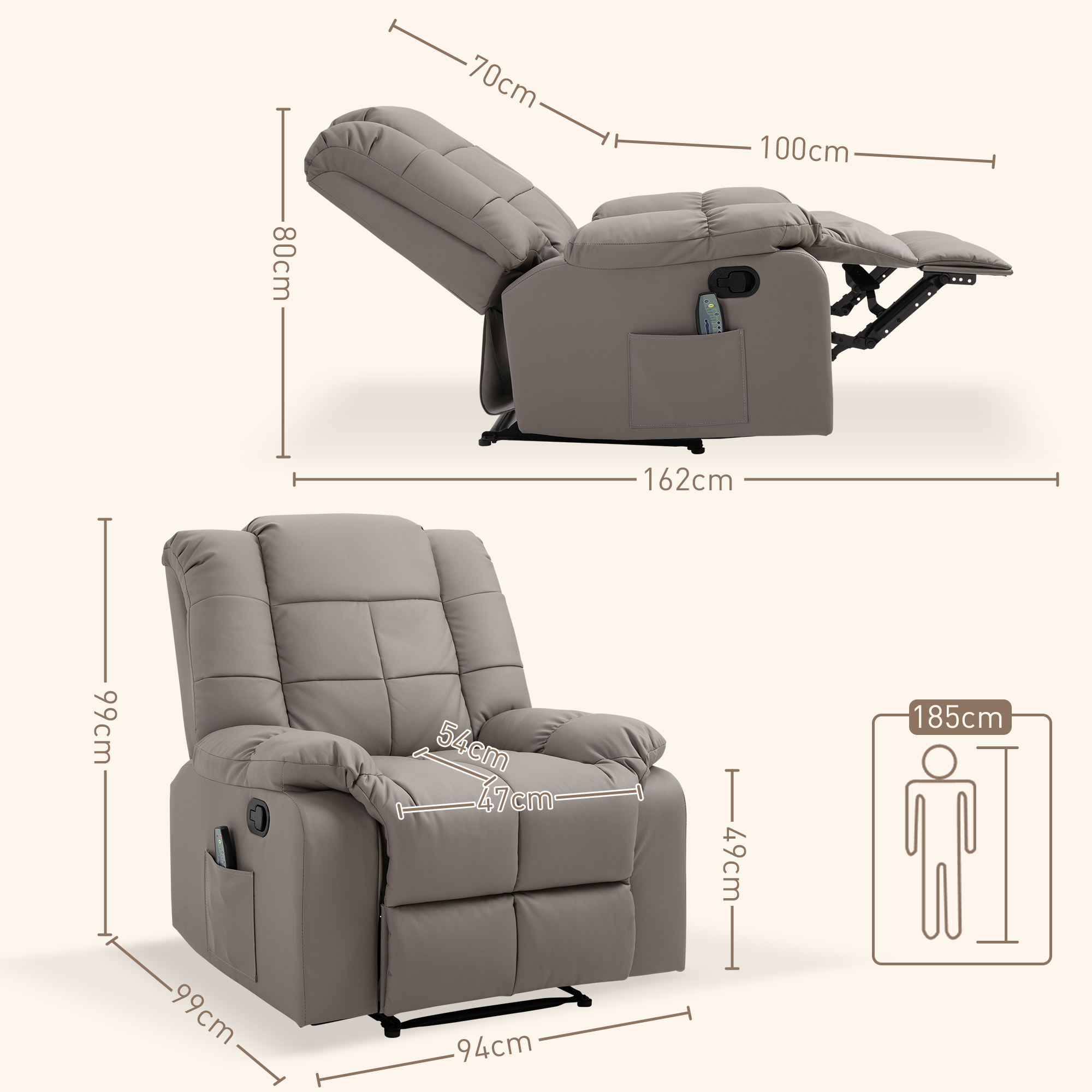 Poltrona Relax con 8 Punti Massaggio e Reclinazione a 165° in Finta Pelle, Grigio
