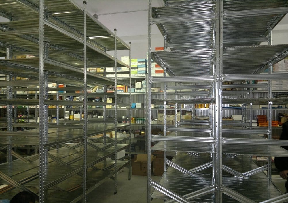 Scaffalatura industriale a ripiani lunghezza 9 metri , altezza 2,50 mt, profondità 50 cm con 5 ripiani in altezza
