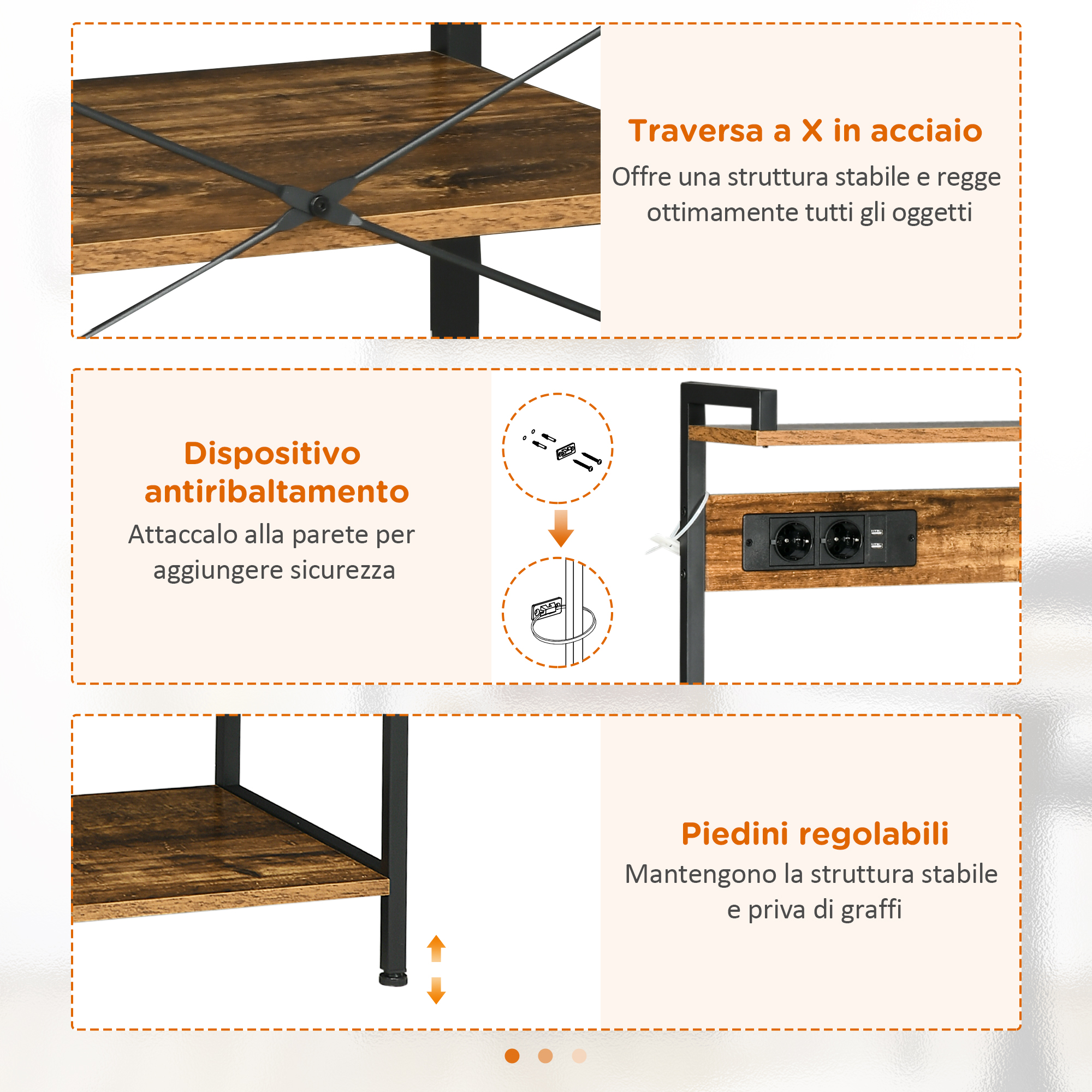 Scaffale Cucina Multipresa per Microonde con Ripiani e Cestino a Rete, 90x42x130cm, Marrone
