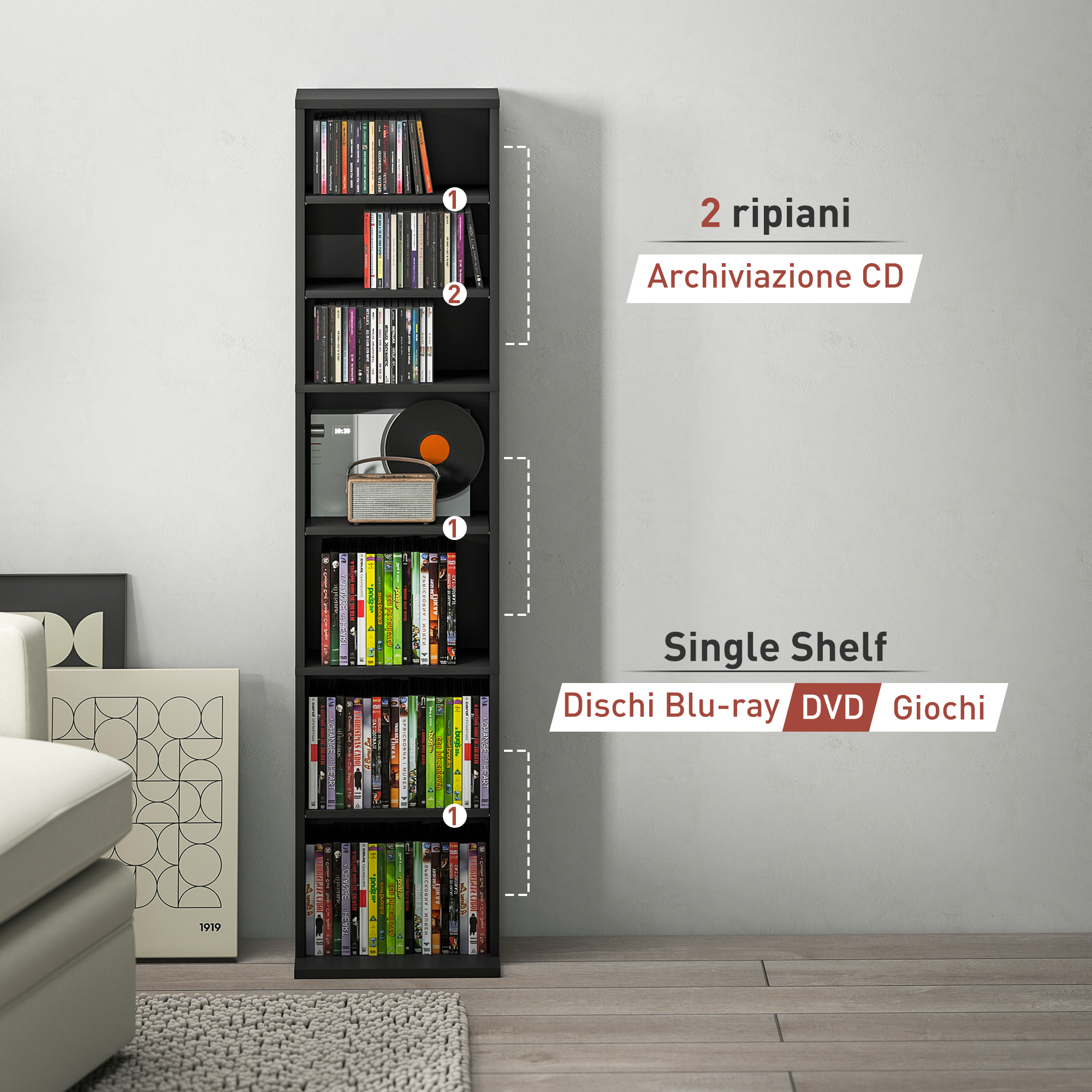 • • La struttura stretta del mobile porta CD massimizza lo spazio in aree piccole