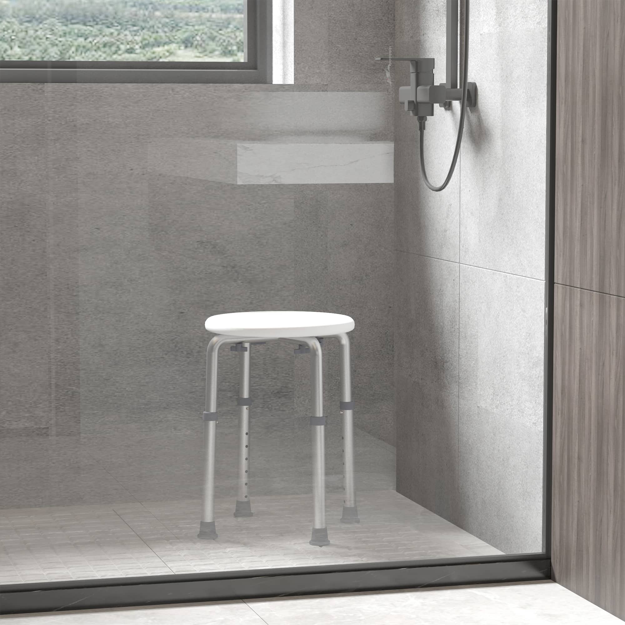 Sgabello da Doccia Girevole a 360° con Piedini Antiscivolo e Regolabile in Altezza su 8 Livelli, Sgabello per Doccia in Alluminio e PE, 32,5x41x35,5-54 cm, Bianco