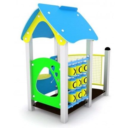 Torretta completa di scivolo pista in acciaio inox e fianchi in polietilene, montanti in acciaio 80×80 mm zincato e verniciato a polveri; tamponamenti, tetto e pannello arrampicata in polietilene alta densit� HDPE.