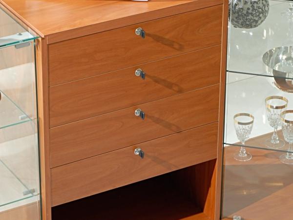 Banco Vendita con 4 cassetti e vano a giorno, Cristallo temperato 5MM con base in legno colore ciliegio, grigio o weng� a scelta, banco vendita vetrina h.90 vetrina profondit� cm 40.