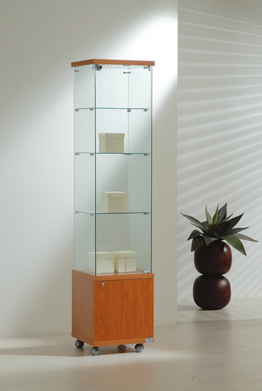 VETRINA Top Cristallo Temperato 5MM con Mobile (H. 43 cm) in kit, Base in legno colore ciliegio, grigio o weng� a scelta, Vetrina con 2 faretti alogeni, vetrina H.181 cm, profondit� 40 cm. Anta con serratura, Ruote piroettanti, Piedini a richiesta, Ripiani fissi a 33 cm di distanza.