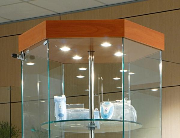 VETRINA motorizzata con ripiani girevoli. Cristallo Temperato 5MM, Base in legno colore ciliegio, grigio o weng� a scelta, Vetrina con 2 faretti alogeni, Vetrina H.187 cm, profondit� 40 cm. Anta con serratura, Ruote piroettanti, Piedini a richiesta, Ripiani girevoli con motore regolabili in altezza.