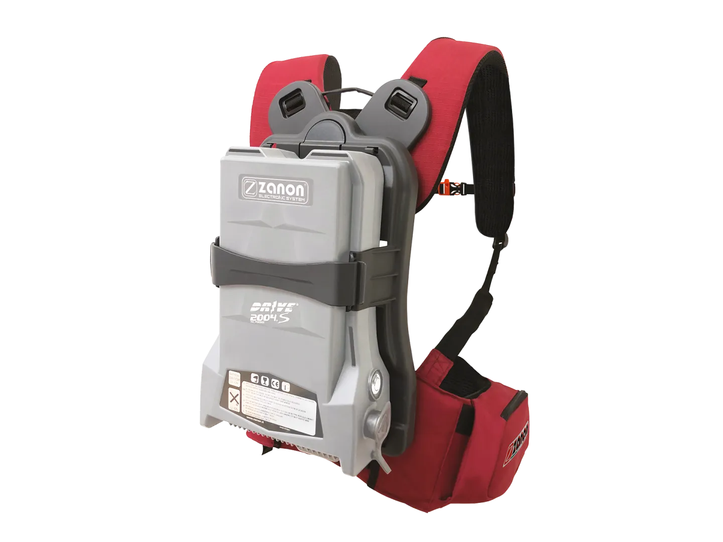 Zaino leggero di color rosso e bordature nere, per portare comodamente batterie della serie DRIVE.S.